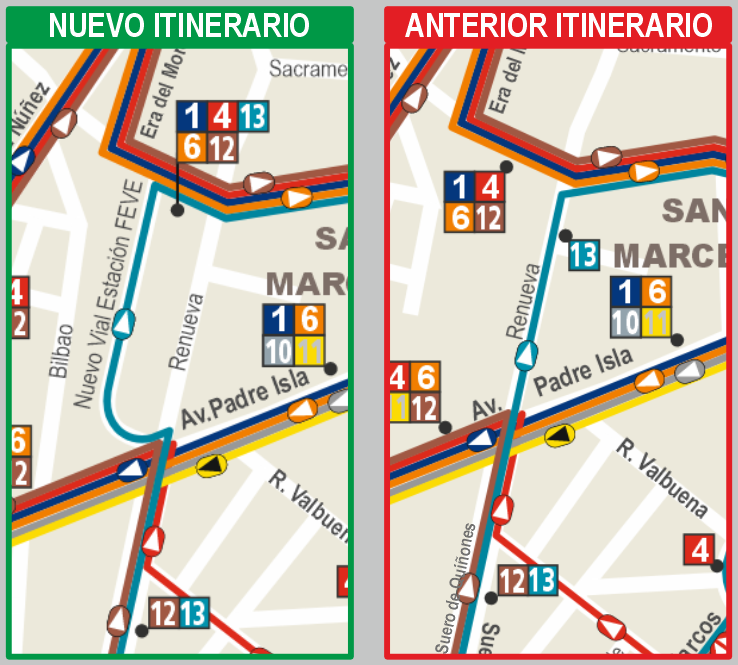 Les informamos que a partir del próximo martes, 27 de mayo de 2025, el servicio de la linea 13 modificará su itinerario suprimiendo la parada de la calle Renueva, 7. El nuevo recorrido será desde Suero de Quiñones por el Nuevo Vial de la Estación de FEVE y la parada de sustitución se realizará en la calle Ramón y Cajal, 43. Consulte el itinerario pulsando aquí.